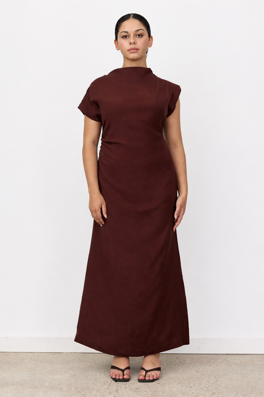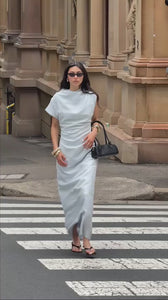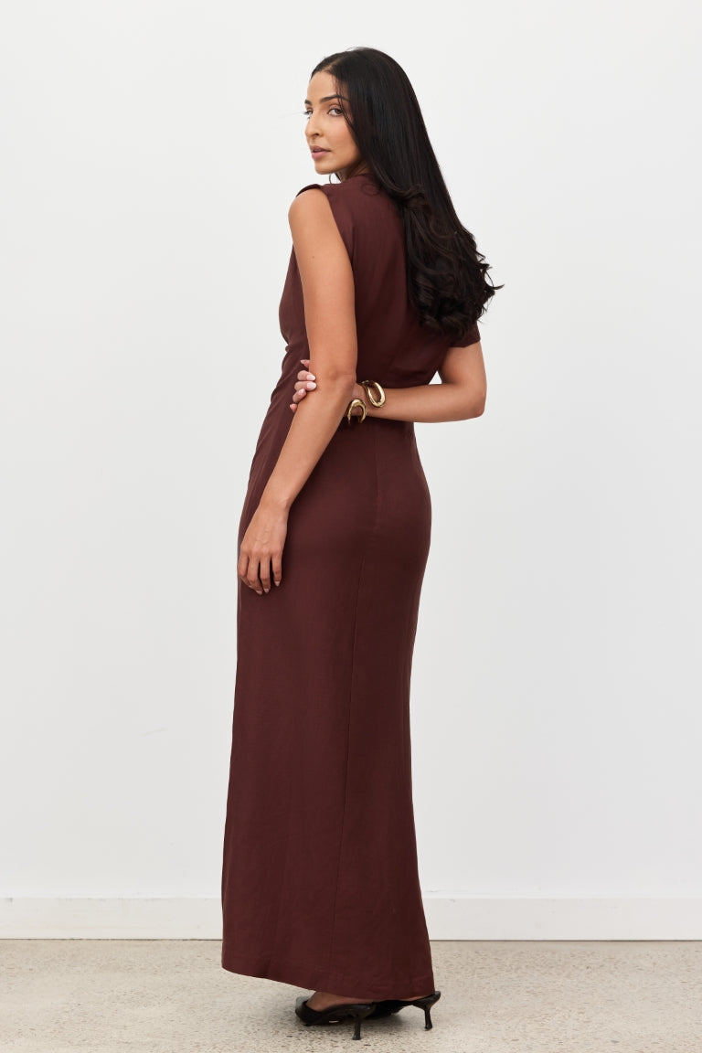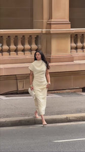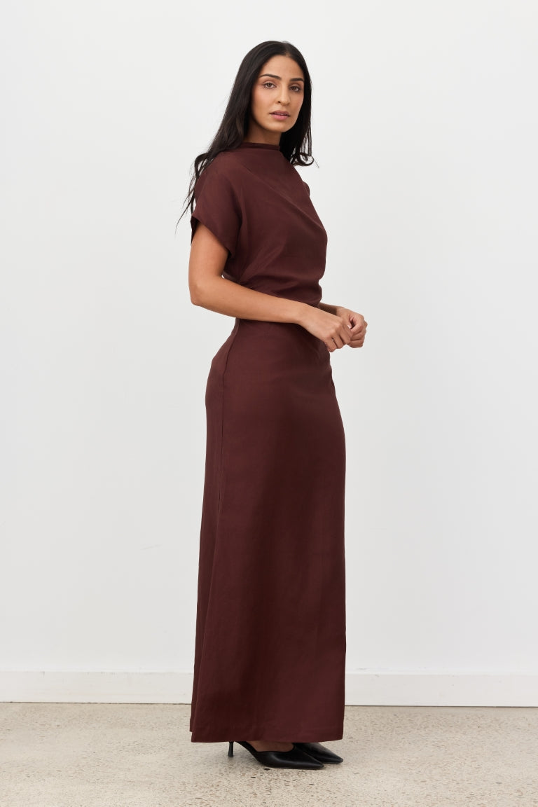 Introducing Velour. Sophisticated elegance redefined. The Velour Dress is a sleek maxi featuring a high neckline and striking asymmetric sleeve - one cap sleeve and one extended sleeve - for a modern, architectural edge. With distinctive cinched side detailing that sculpts a flattering silhouette, its figure-hugging fit and luxurious drape transition effortlessly from boardroom to evening soirée.