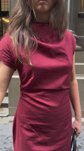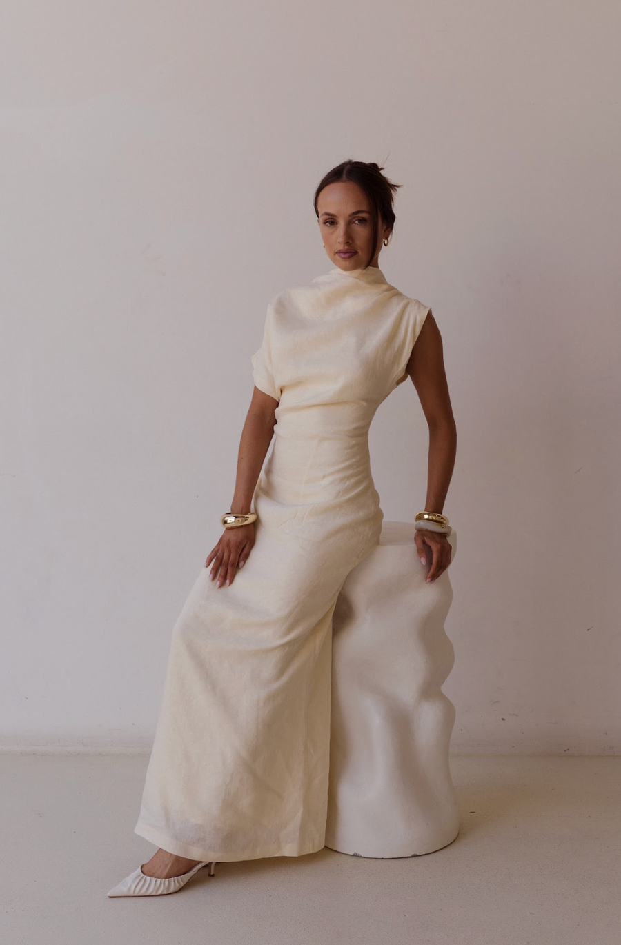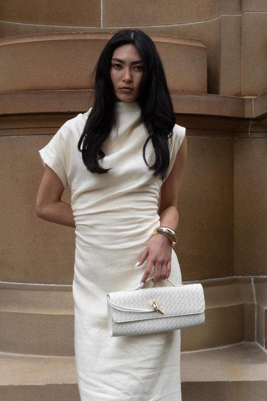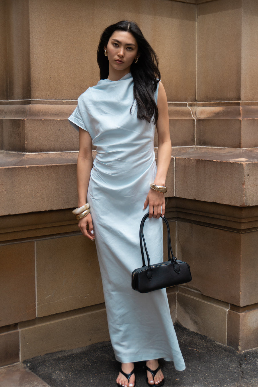 Introducing Velour. Sophisticated elegance redefined. The Velour Dress is a sleek maxi featuring a high neckline and striking asymmetric sleeve - one cap sleeve and one extended sleeve - for a modern, architectural edge. With distinctive cinched side detailing that sculpts a flattering silhouette, its figure-hugging fit and luxurious drape transition effortlessly from boardroom to evening soirée.