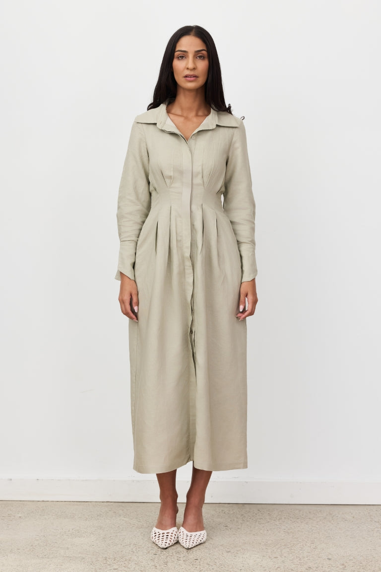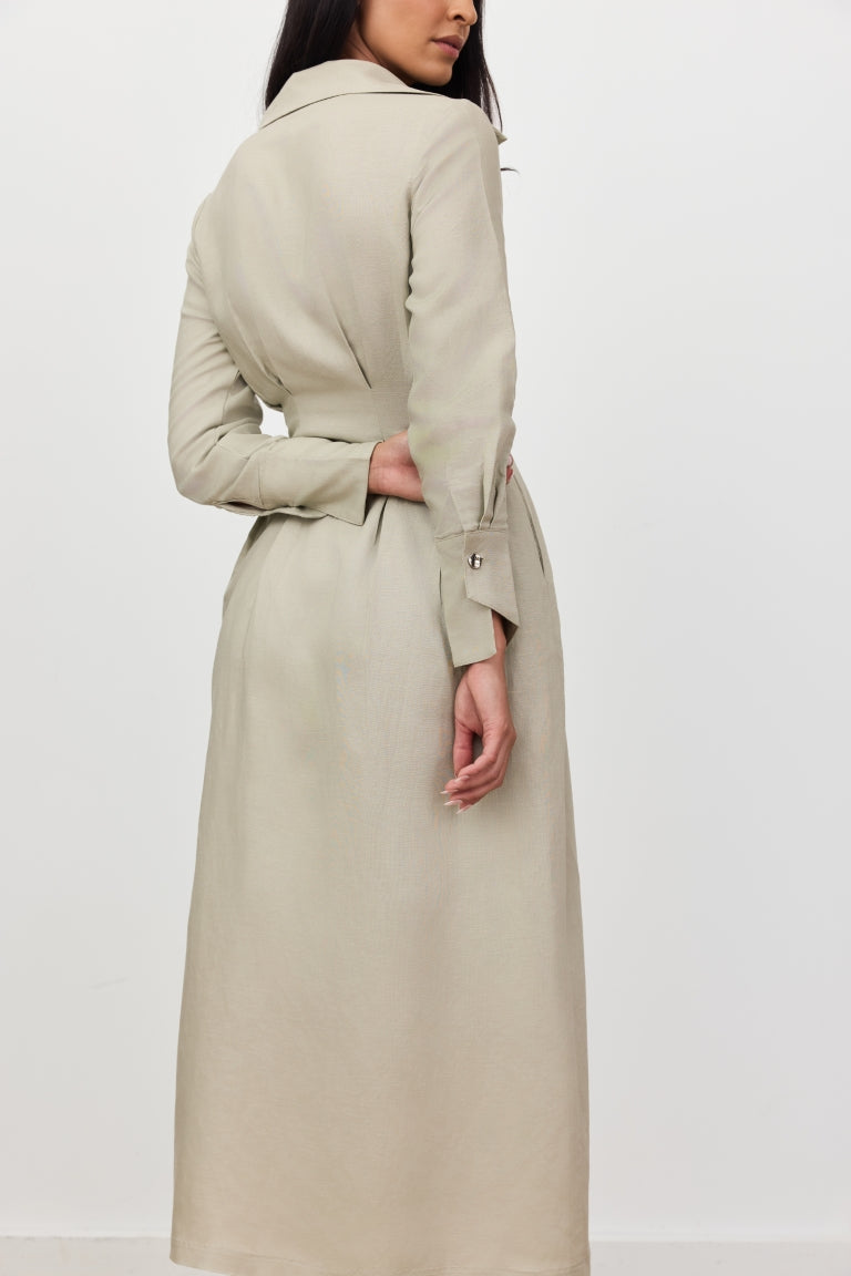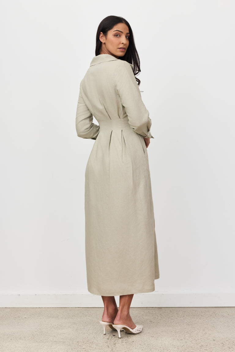 The Florence Dress is a timeless linen blend maxi designed with considered structure and elevated detailing. Fully lined for comfort and coverage, it features subtle waist shaping to flatter the silhouette and falls into a clean, elongated maxi length for effortless wear. The long sleeves are finished with refined cuff detailing, while a statement silver top button and matching silver sleeve buttons add a polished, modern finish.