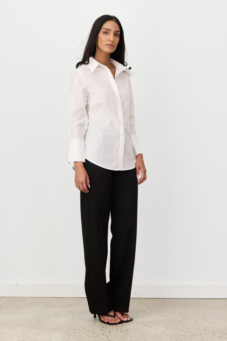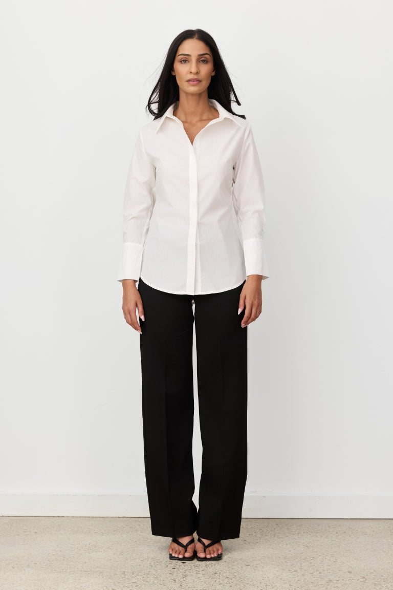 The Camille Shirt is a modern take on a classic wardrobe staple, designed with clean lines and considered detailing. Crafted in a crisp white fabrication, it features a structured collar and long sleeves with refined cuff finishes. Subtle shaping through the back creates a flattering, tailored silhouette while maintaining an effortless, relaxed feel.